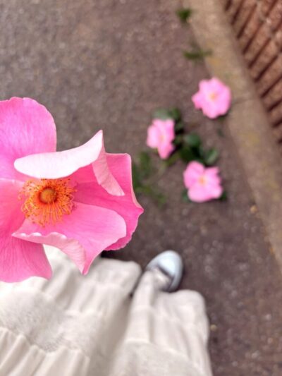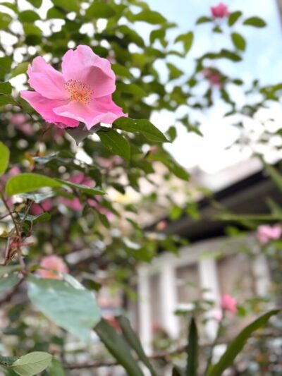 お隣の庭のピンクのバラが