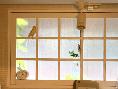 キッチン窓の外の緑が
